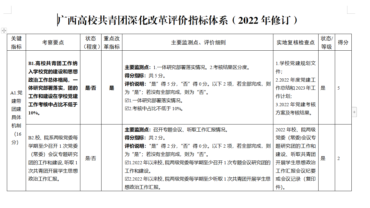 广西高校共青团深化改革评价指标体系(2022年修订)