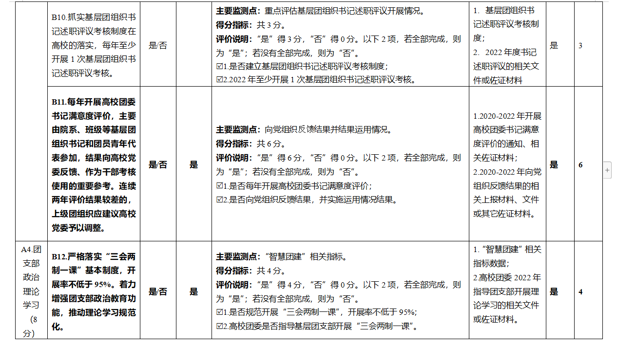 1.在责任落实方面。以“提升组织力、提升引领力、提升服务力、提升贡献度”四个维度工作质效为目标,强化“全面从严治团”“全面深化改革”政治保障,构建“三力一度两保障”考核评价体系,充分运用“三力一度两保障”考评成果,及时客观总结团组织书记的工作成绩和亮点、指出问题和不足。建立和抓实基层团组织书记述职评议考核制度,每年开展1次基层团组织书记述职评议考核,我校2022年基层团组织书记述职评议考核将在12月下旬开展。