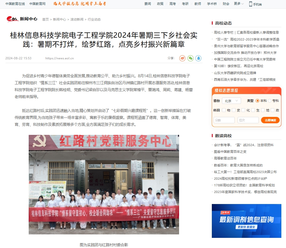 随着社会实践活动的圆满收官,我校社会实践成果验收工作也取得了显著成效。活动不仅获得了实践接收单位及乡镇社区的高度认可,还吸引了包括中国青年网、人民网、今日头条、桂林日报在内的多家权威媒体广泛关注与深入报道,累计发布相关报道逾百篇,产生了广泛的社会影响,充分展示了活动的深远意义和积极成果。