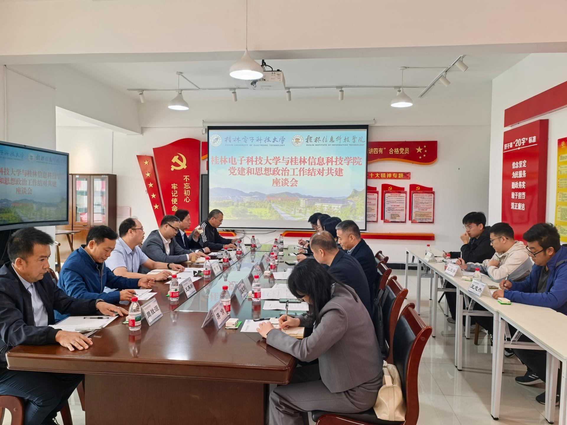 【结对共建】我校与桂林电子科技大学开展党建与思想政治工作互派人员座...为扎实推进共建对接,11月10日上午,学校党委副书记李飞带队赴桂林电子科技大学参加座谈交流会。桂林电子科技大学党委常委、组织部部长黄可以及组织部、宣传部、学工处、教务处、人事处等相关部门负责人热情接待...