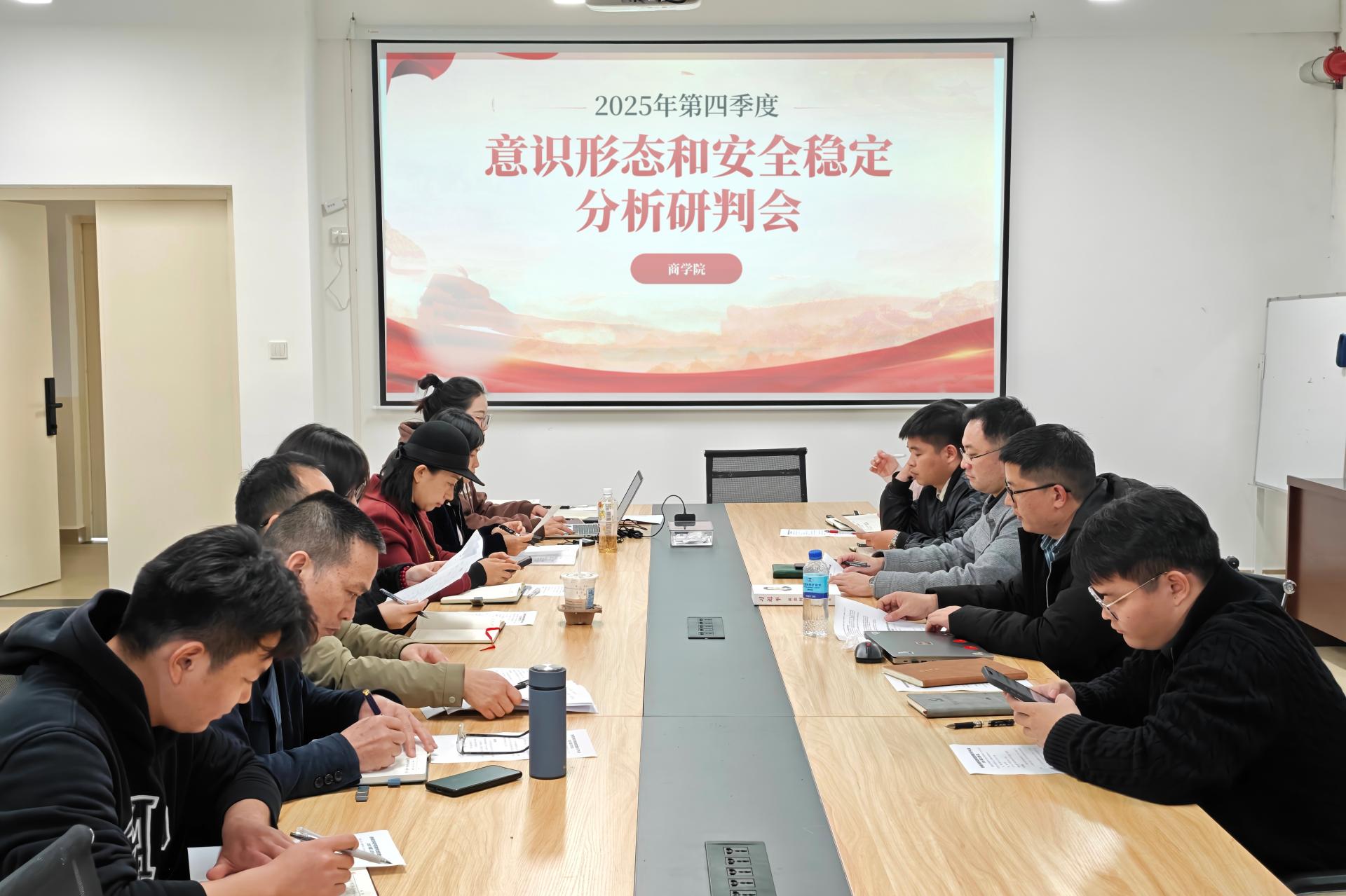 商学院召开2025年第四季度意识形态和安全稳定分析研判会12月19日,商学院在汇通楼H612召开2025年第四季度意识形态和安全稳定分析研判会。学院党委班子成员、各党支部书记及组织员参加会议,党委书记许奇主持会议。会议总结了学院第四季度意识形态工作成效,围绕年末意...