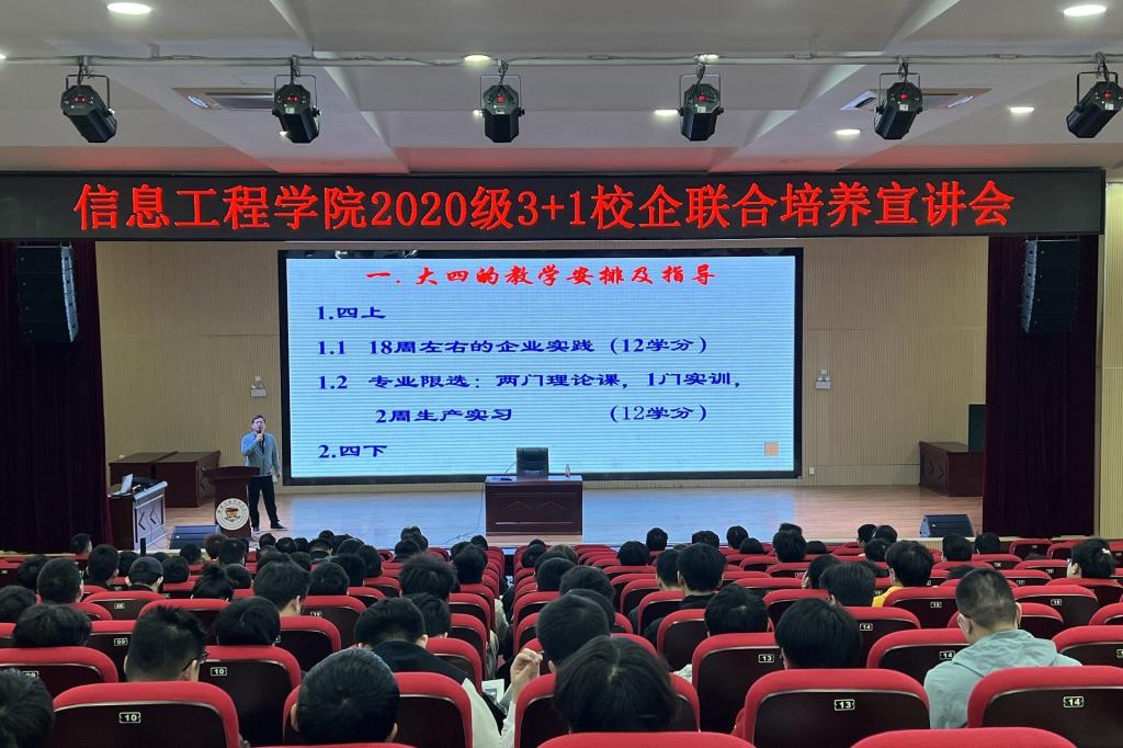 近日,信息工程学院在51206报告厅召开了2020级校企联合培养动员大会。本次会议由我院2020级辅导员陆鑫组织,学院院长黄建灯主讲,党总支书记郭健和各教研室教师代表出席会议。