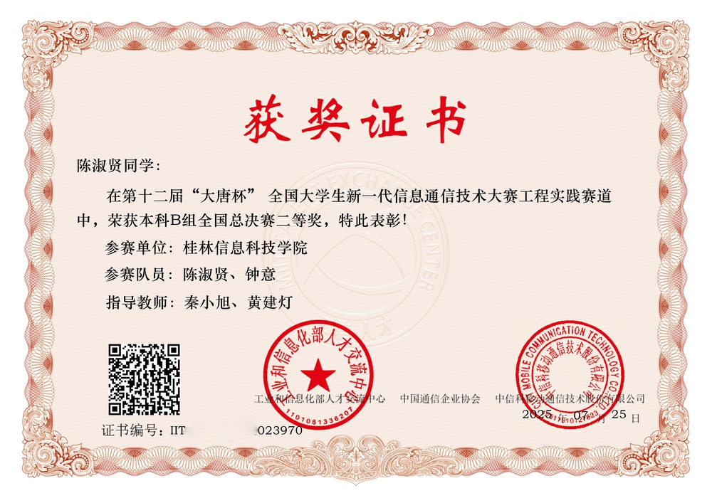近日,第十二届“大唐杯”全国大学生新一代信息通信技术大赛官网公布全国总决赛结果,我校信息工程学院学子再创佳绩,获国家级二等奖1项,国家级三等奖1项。