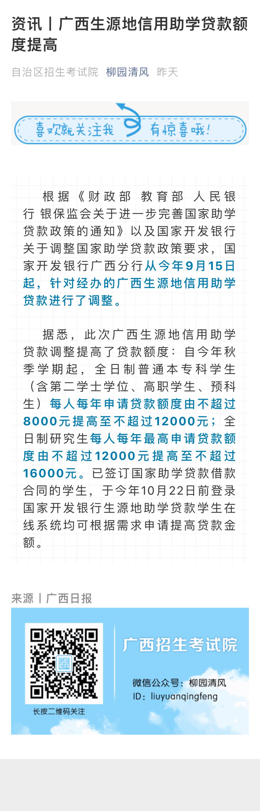 最新资讯:广西生源地信用助学贷款额度提高